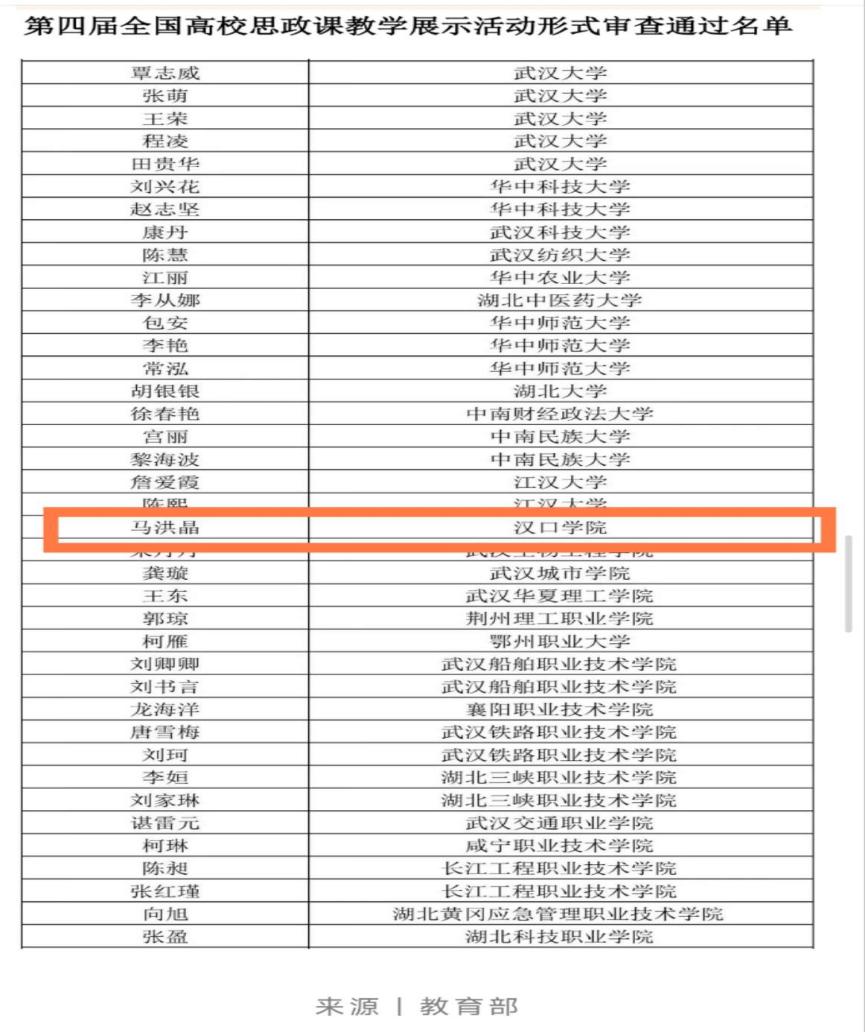 (通讯员:刘丽)11月20日,教育部社会科学司发布了第四届全国高校思政课教学展示活动形式审查通过名单,汉口学院马克思主义学院院长祝璇教授主持、骨干教师马洪晶展示的“毛泽东思想和中国特色社会主义理论体系概论”课程(简称“概论课”)教学团队榜上有名,首次创造了学校和学院在思政课教学展示活动赛事级别上的历史最佳纪录。